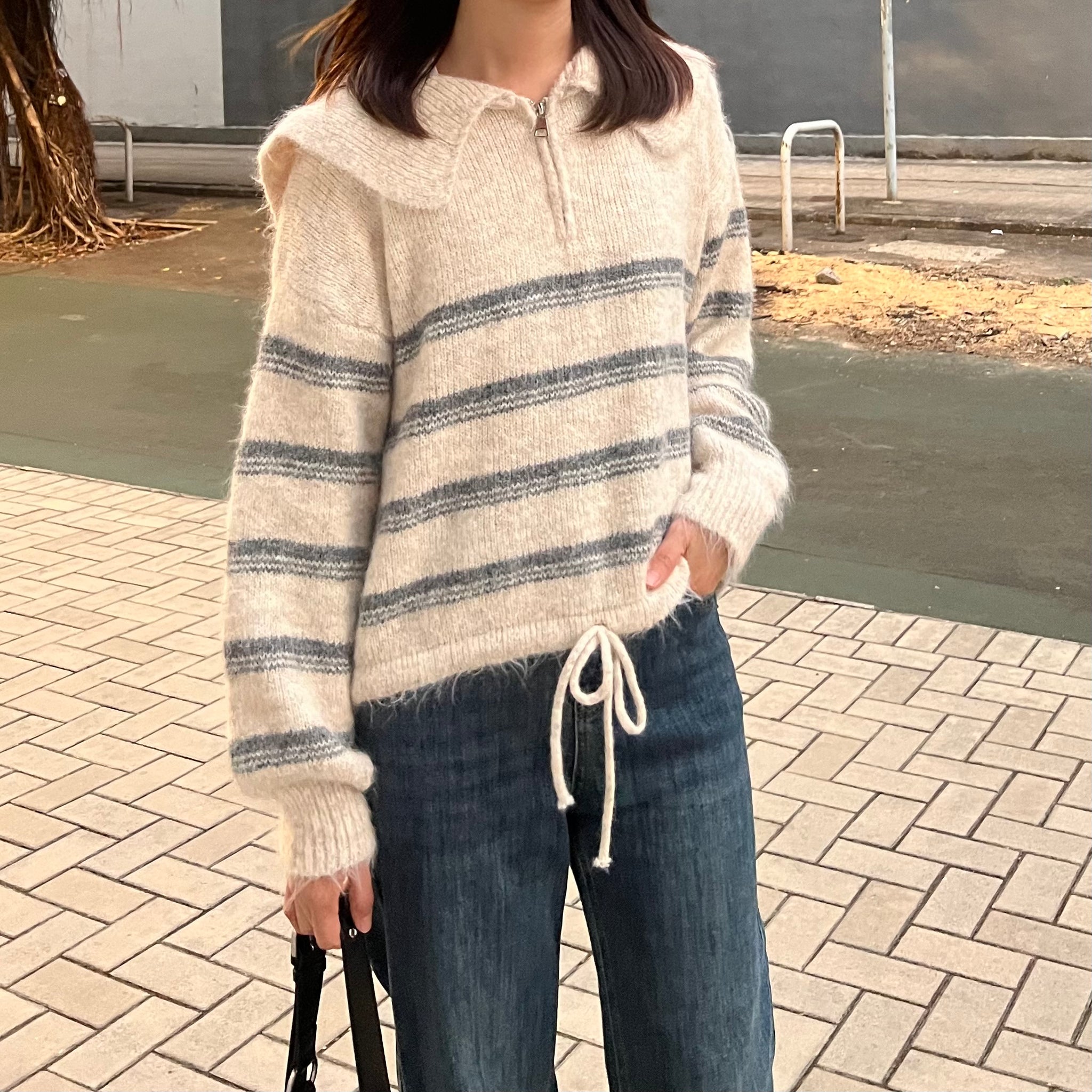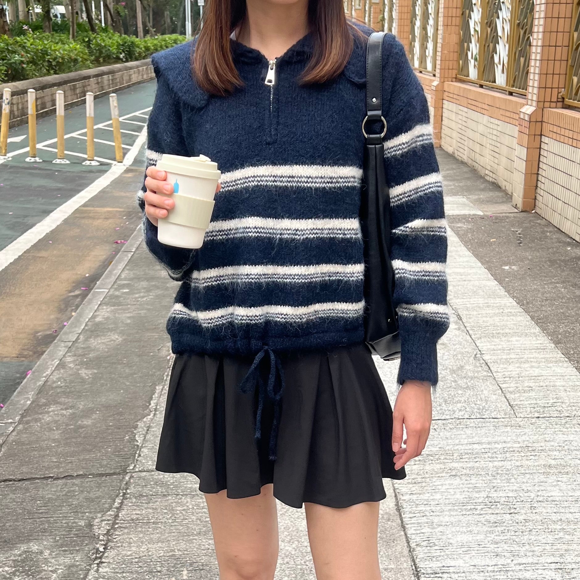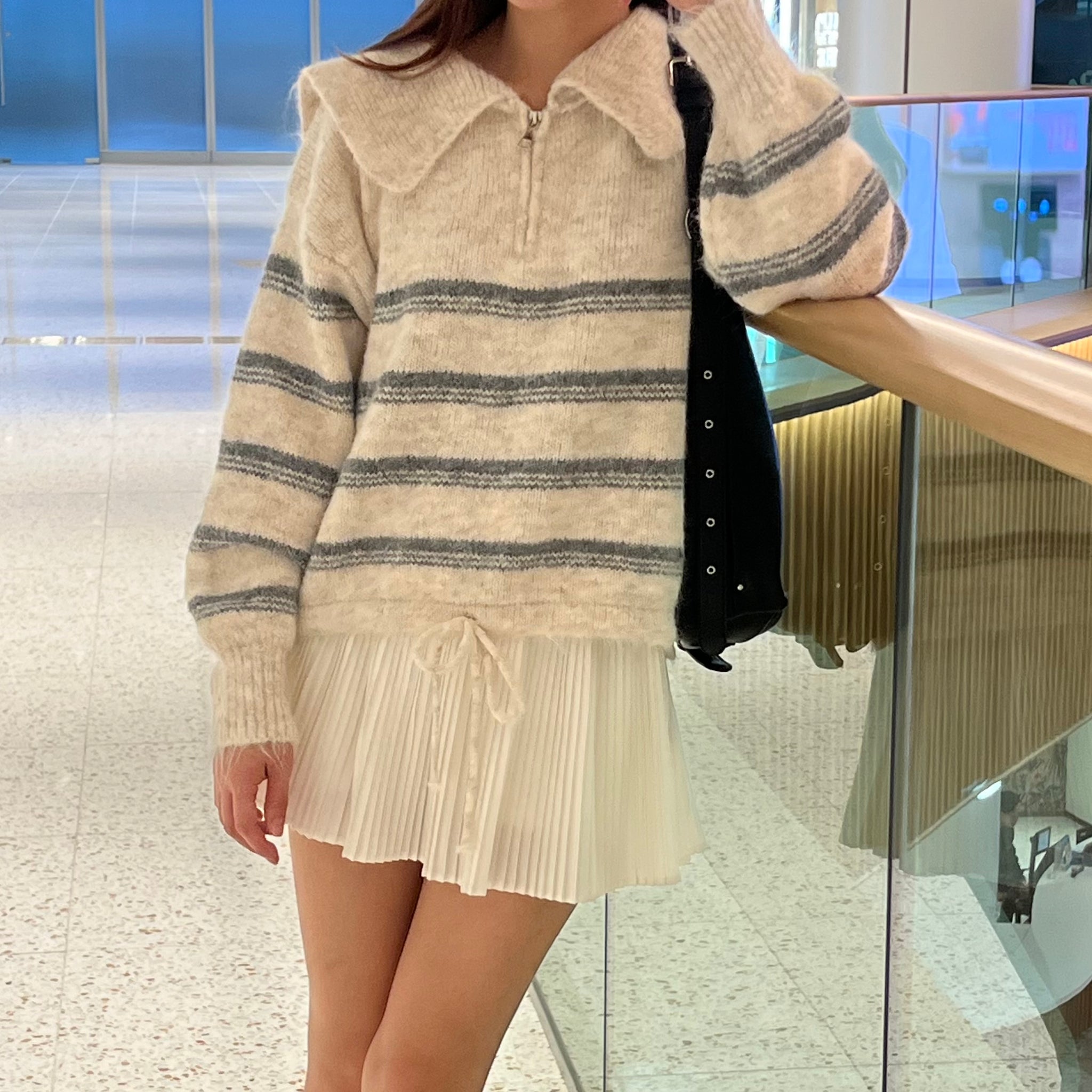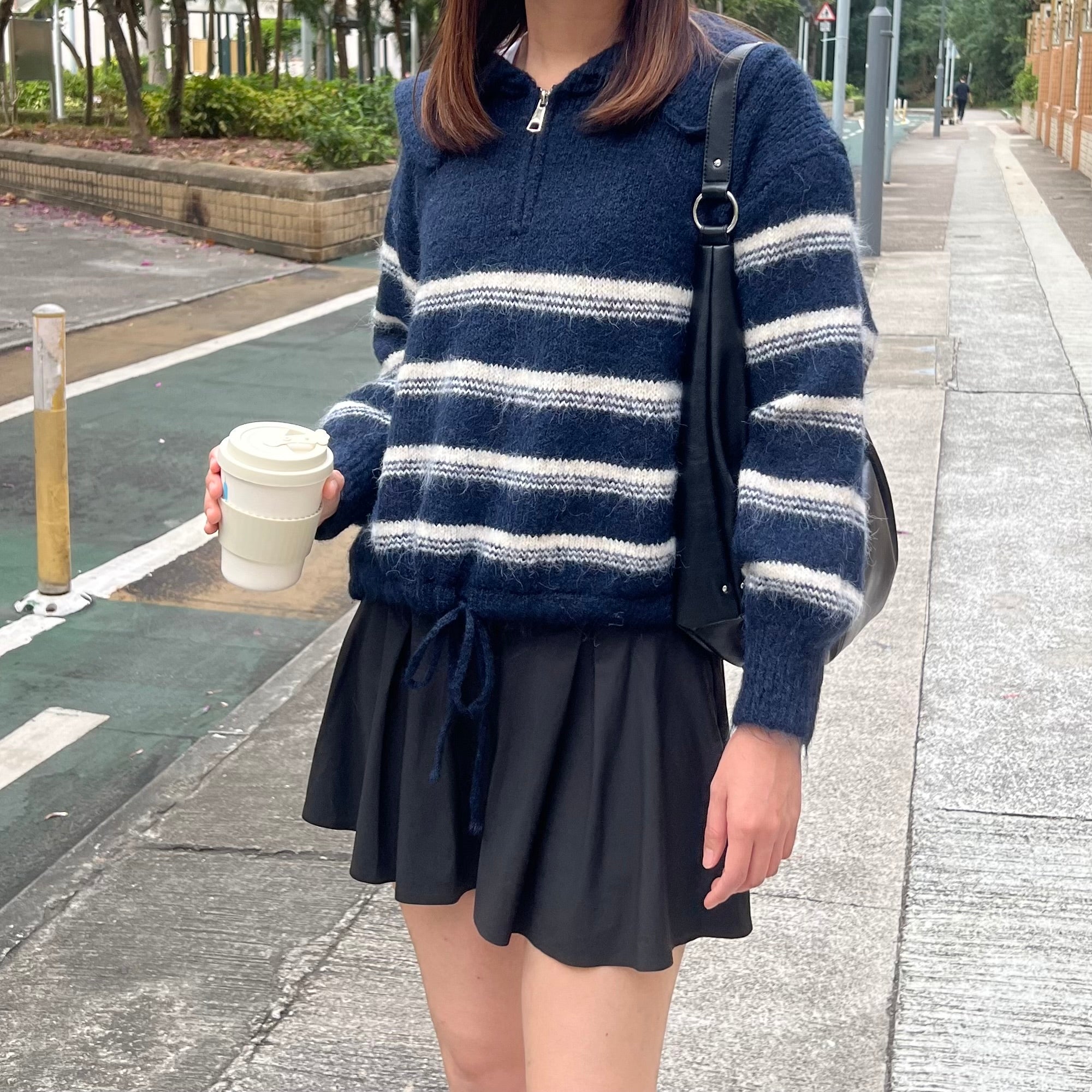 間條半拉鍊索腰上衣